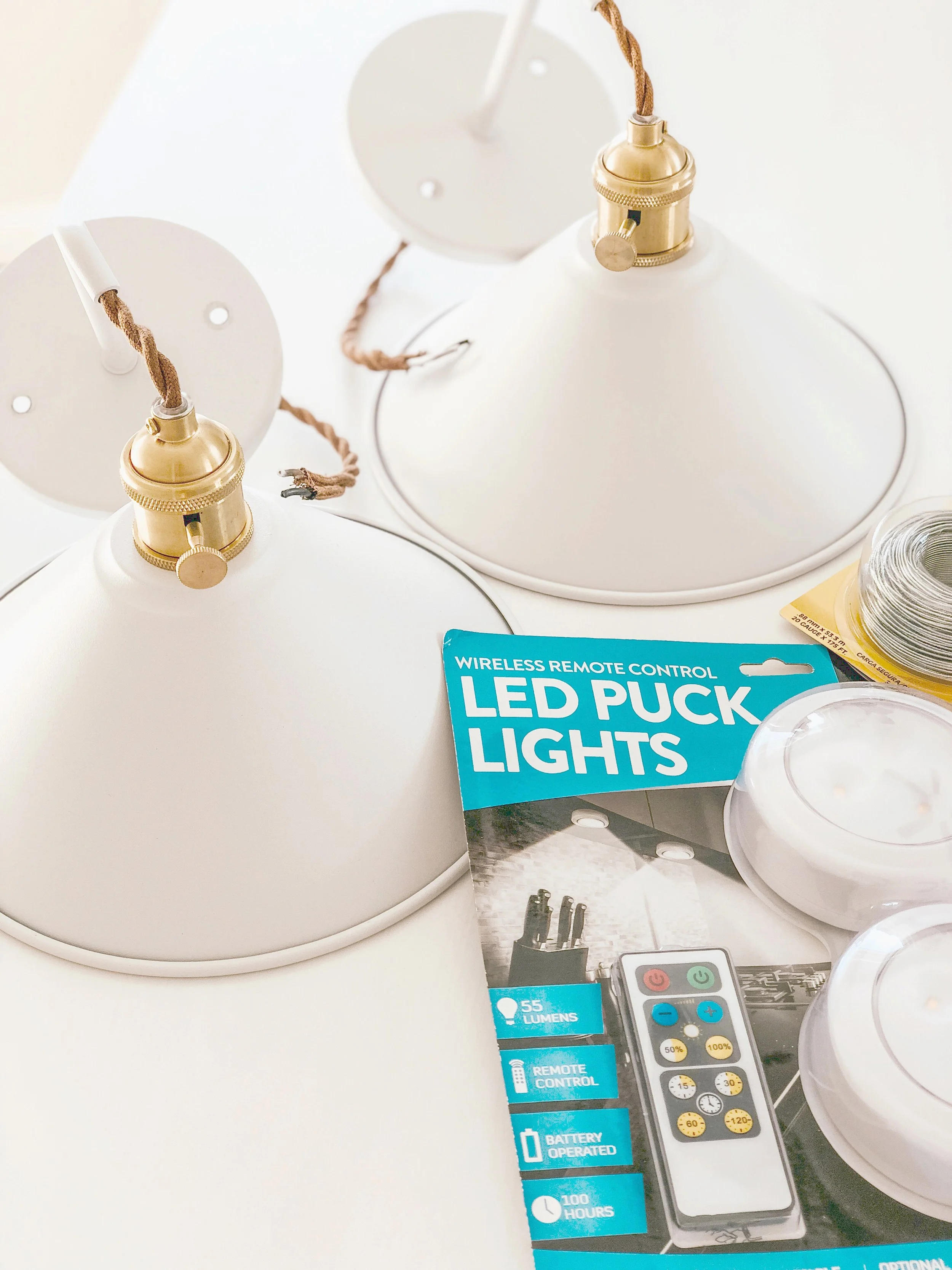 I ordered these battery operated puck lights from Amazon and actually already had the wire. I used 20 gauge jewelry making wire, but any wire would work! I knew I only needed 2 puck lights so went with this pack. (They do sell larger packs as well if you wanted to use them for under-cabinet lighting or something similar though)
