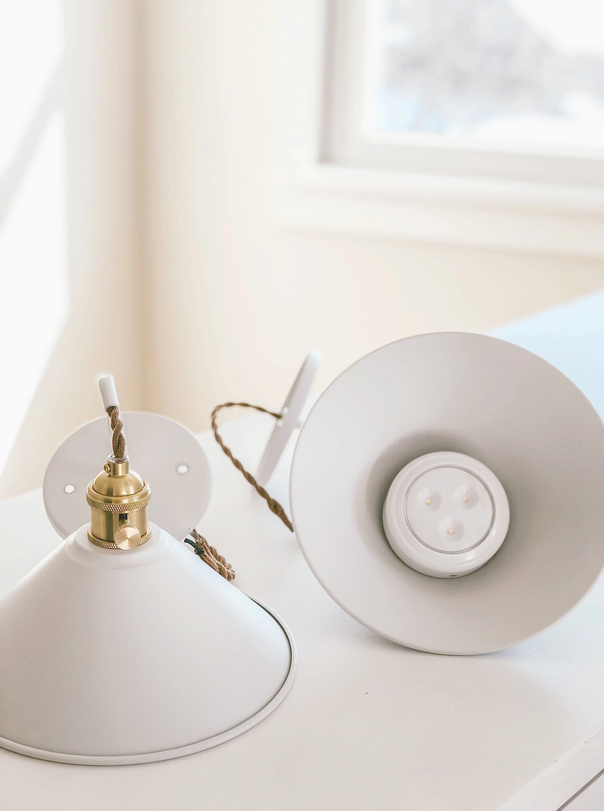 As most of you know we have been hard at work prepping our little girl’s nursery, when dreaming up this space I remembered this DIY tutorial I had stumbled upon almost a year ago! I knew we needed some sort of lighting in the nursery but I didn’t really want to have a lamp on her dresser/changing table. So… enter the magic light trick; which allows you to use remote control puck lights in sconces instead of having to hire an electrician to run power to them! Genius!